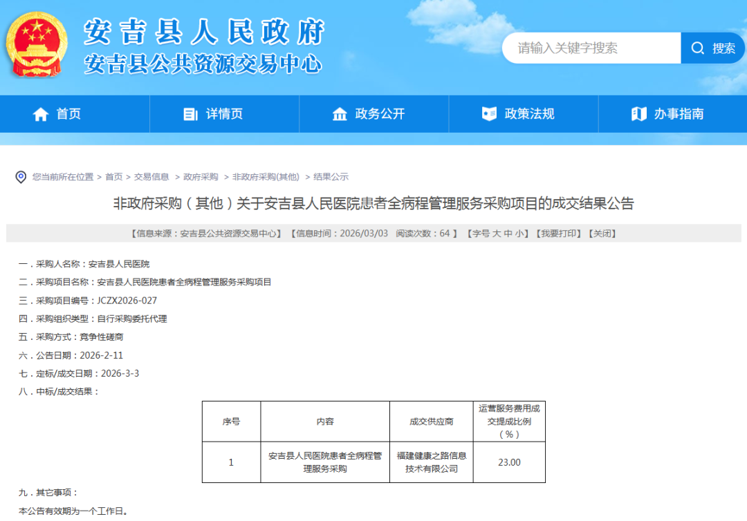 近日,健康之路凭借AI技术创新、全病程管理市场化方案及医疗数智化转型升级项目的综合能力,成功中标安吉县人民医院患者全病程管理服务采购项目。