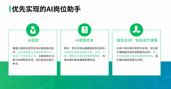 在这一战略指引下,健康之路率先在医疗健康领域展开AI助手的落地应用,重点打造了“AI医助”和“AI健康管家”两大智能岗位。