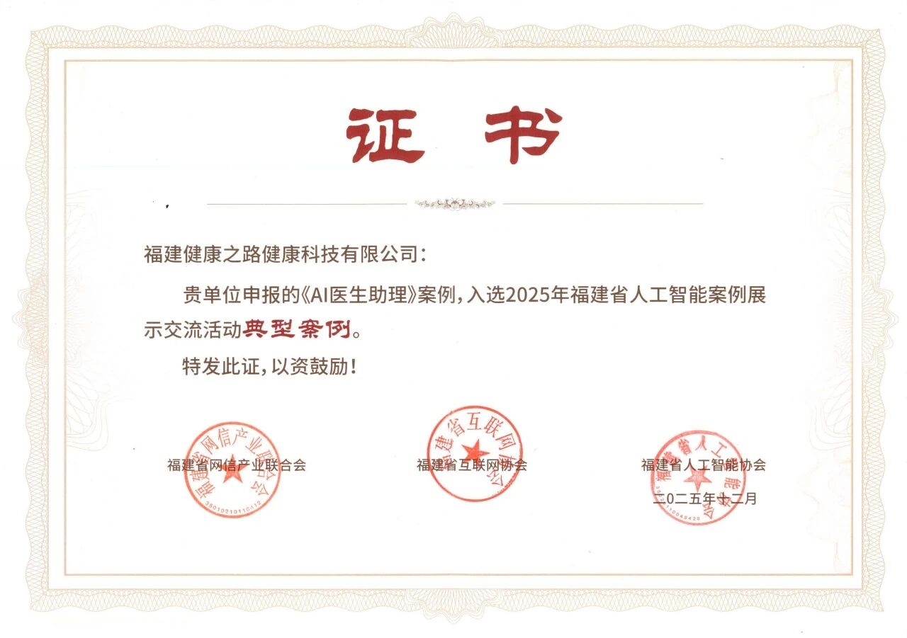 近日,2025年福建省人工智能案例展示交流活动典型案例名单正式揭晓,健康之路申报的“AI医生助理”凭借创新技术应用与显著实践价值成功入选,成为医疗健康领域人工智能赋能的标杆典范。